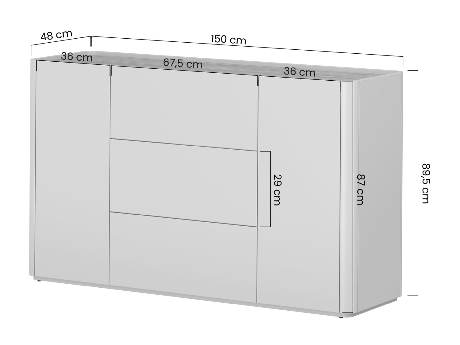 Kumodes izmēri89.5 x 150 x 48 cm