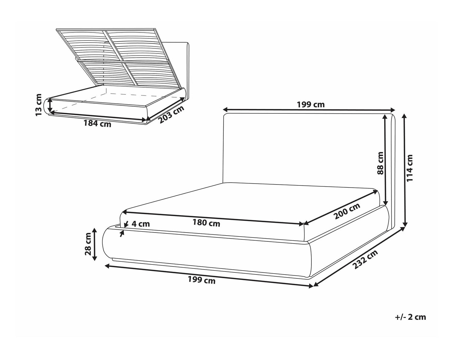 Gultas kastes izmēri13 x 184 x 203 cm