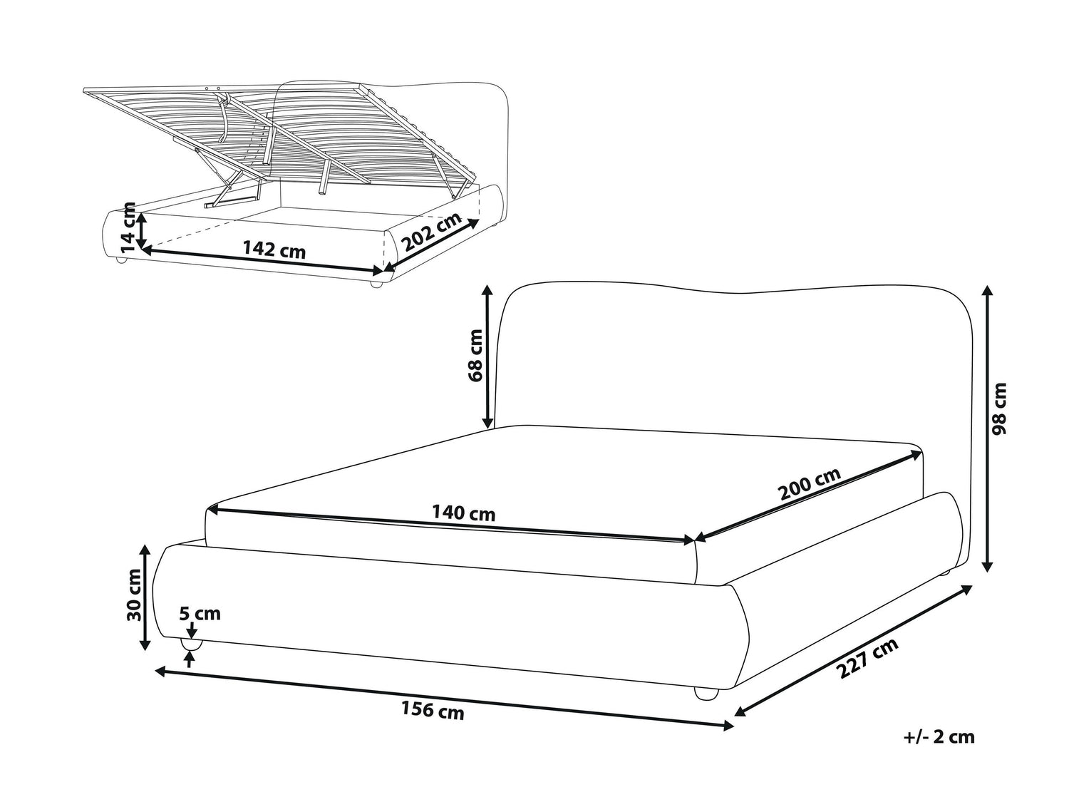 Gultas kastes izmēri14 x 142 x 202 cm