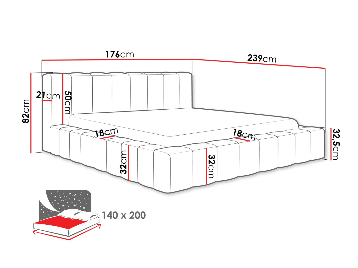 Gultas kastes izmēri28 x 140 x 200 cm