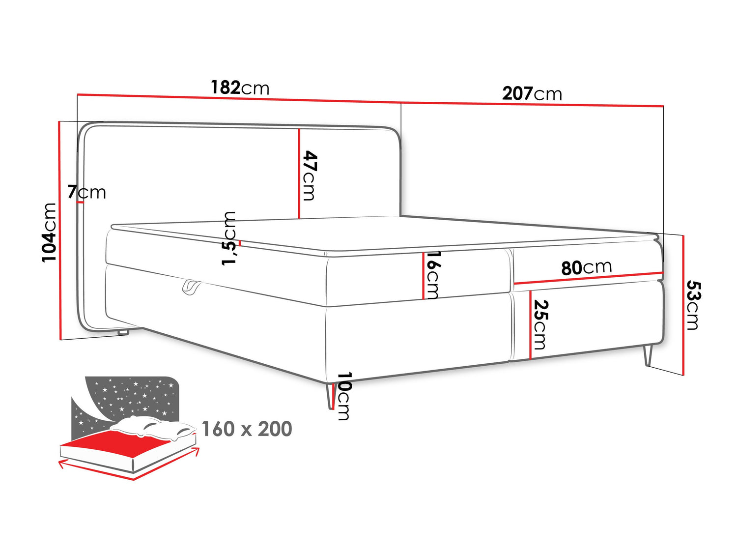 Gultas kastes izmēri25 x 77 x 197 cm