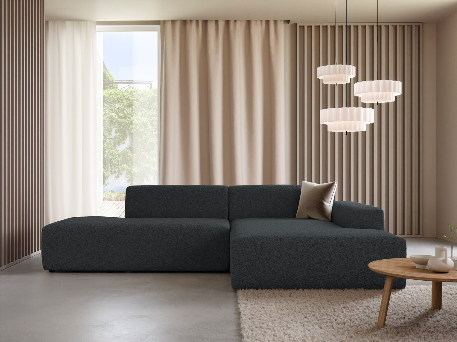 "Boucle" (Bouclé) audums ir pazīstams ar savu unikālo tekstūru, ko veido dažāda izmēra cilpas un mezgli. Tas piešķir mēbelēm raksturu un mājīgumu. Auduma tekstūra var būt mīksta vai līdzīga vilnai. Pateicoties izturīgajai struktūrai, šis audums labi saglabā formu, tāpēc tas ir piemērots dīvāniem, krēsliem un citām mēbelēm. Ja mērķis ir radīt elegantu un modernu telpu, šī auduma mēbeles būs lieliska izvēle.
