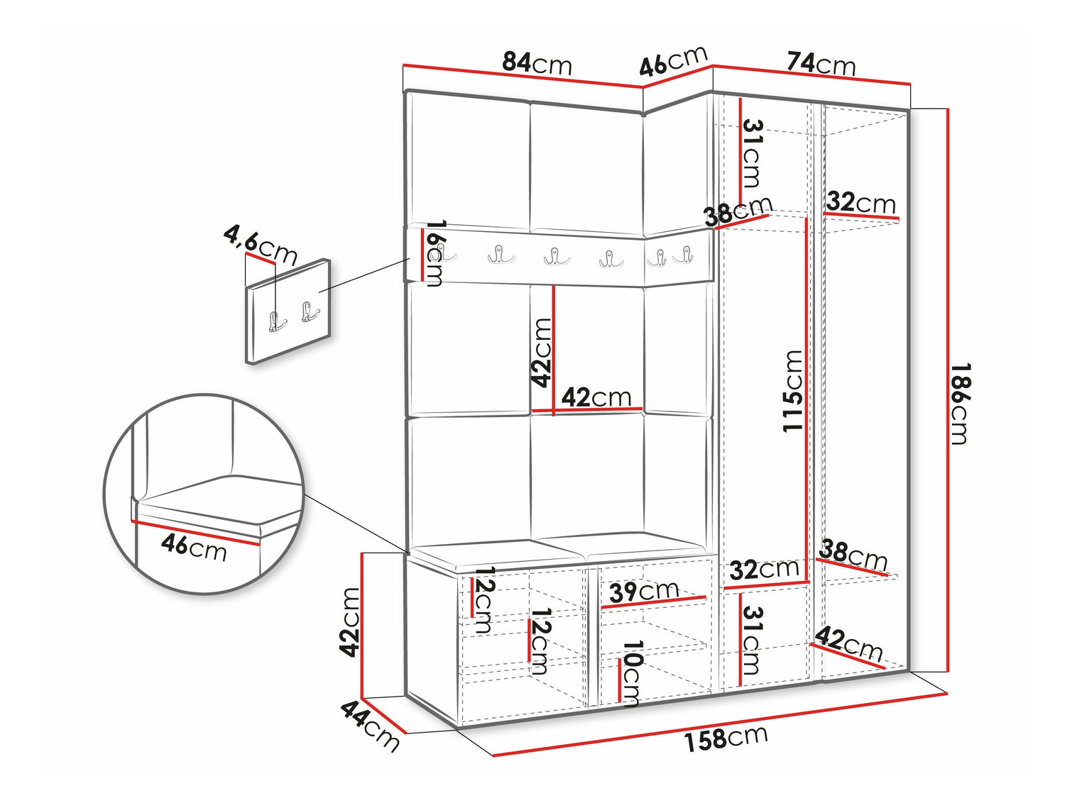 16 x 84 x 4.6 x 46 x 4.6 cm