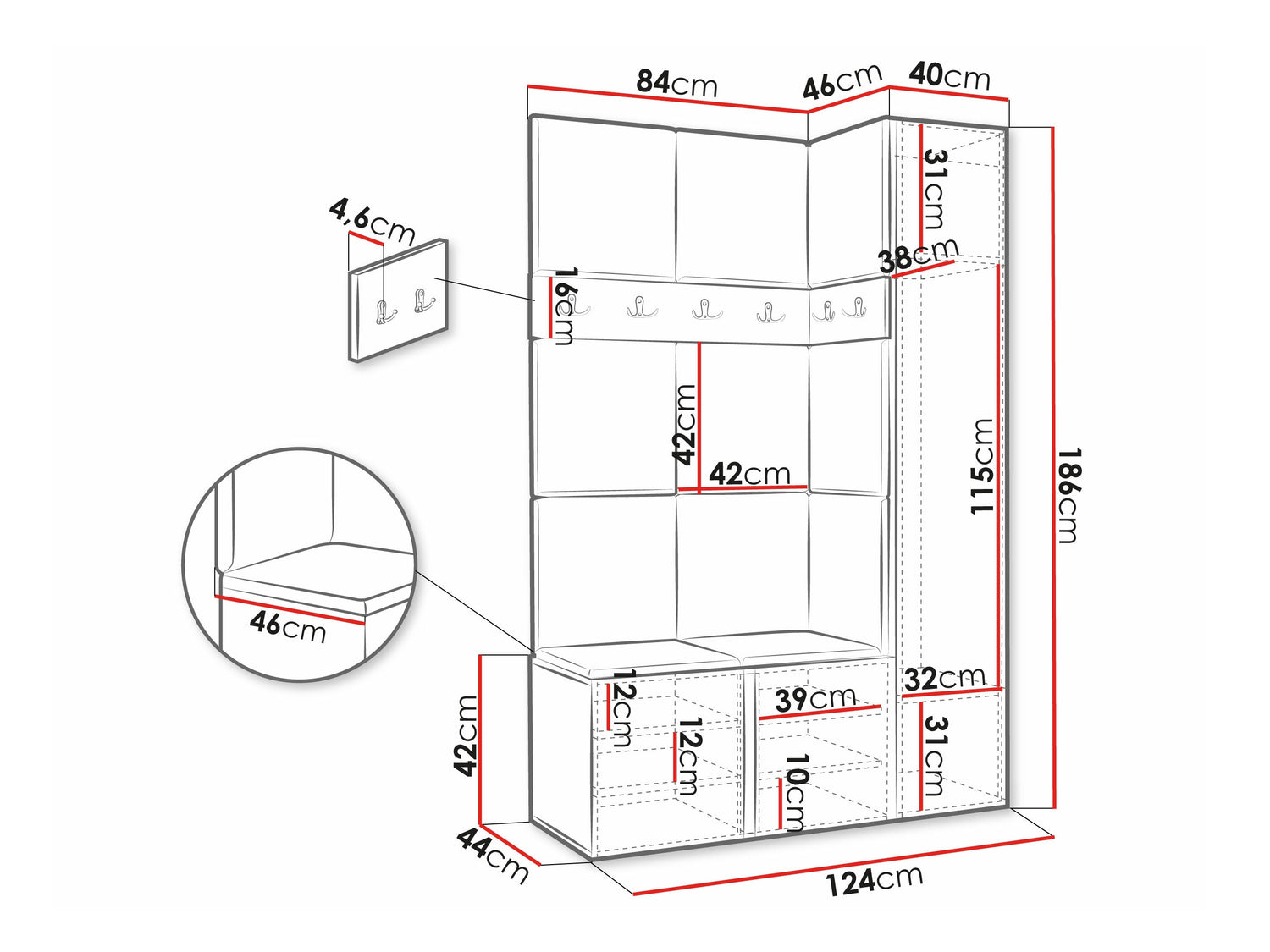 16 x 84 x 4.6 x 46 x 4.6 cm