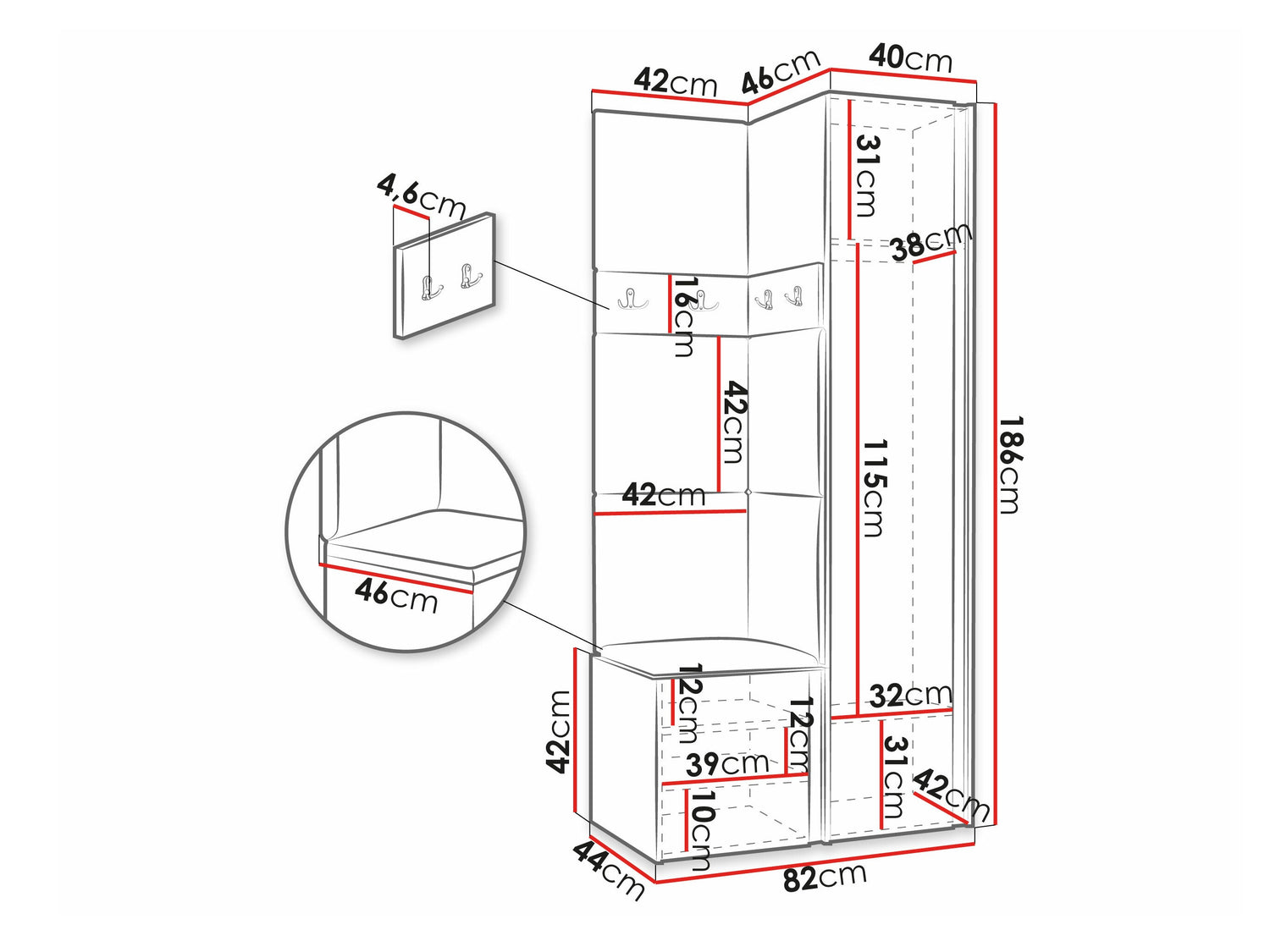 186 x 40 x 46 cm