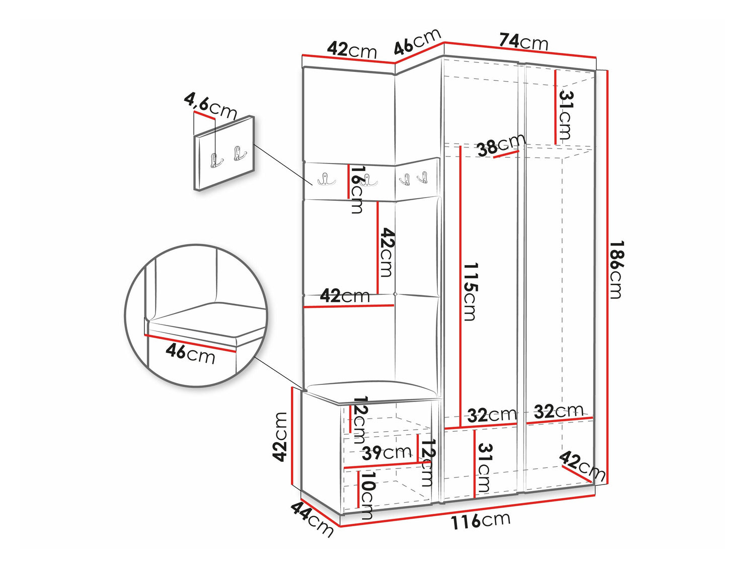 Skapja platums186 x 74 x 46 cm