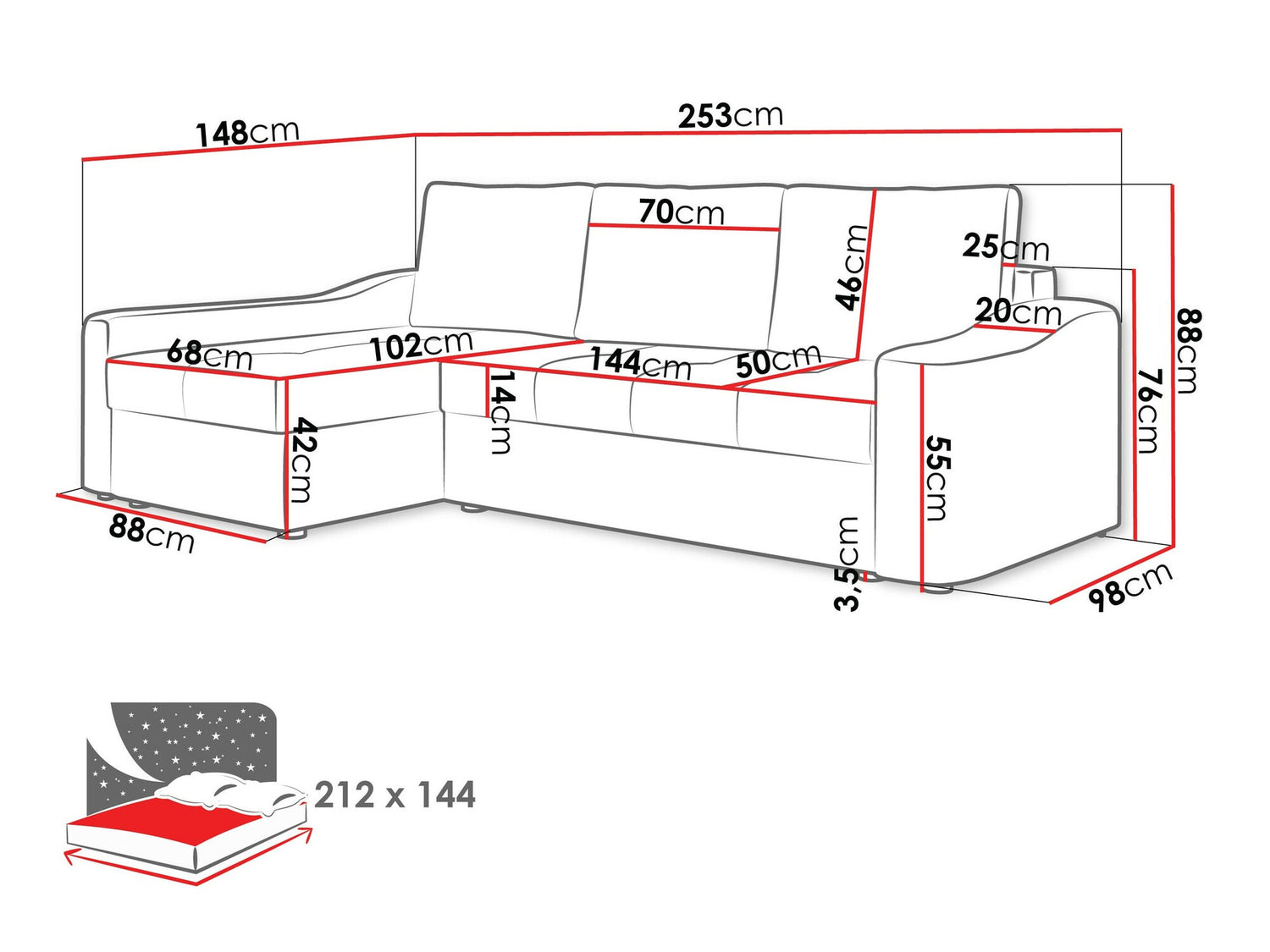 Guļamvietas platums144 cm