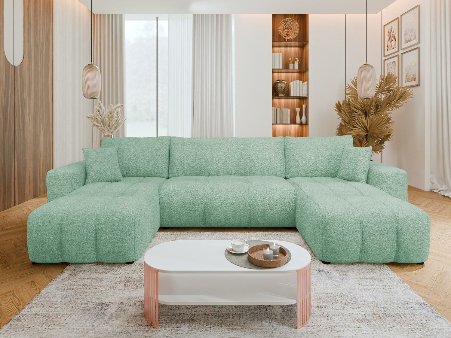 "Boucle" (Bouclé) audums ir pazīstams ar savu unikālo tekstūru, ko veido dažāda izmēra cilpas un mezgli. Tas piešķir mēbelēm raksturu un mājīgumu. Auduma tekstūra var būt mīksta vai līdzīga vilnai. Pateicoties izturīgajai struktūrai, šis audums labi saglabā formu, tāpēc tas ir piemērots dīvāniem, krēsliem un citām mēbelēm. Ja mērķis ir radīt elegantu un modernu telpu, šī auduma mēbeles būs lieliska izvēle.