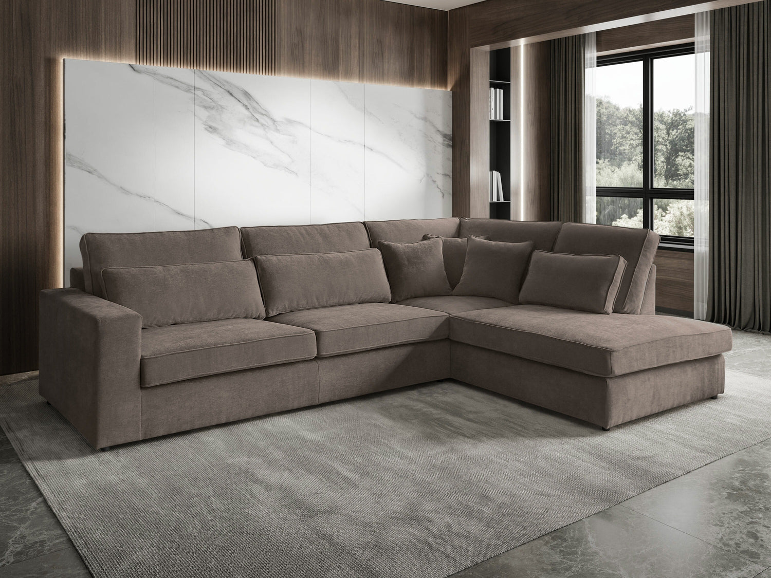 Skatoties uz dīvānu no priekšpuses, dīvāna garākā sānu mala atrodas labajā pusē. Izvēlieties telpas plānojumam atbilstošu stūra dīvāna variantu, lai tas netraucētu ērti un brīvi pārvietoties.