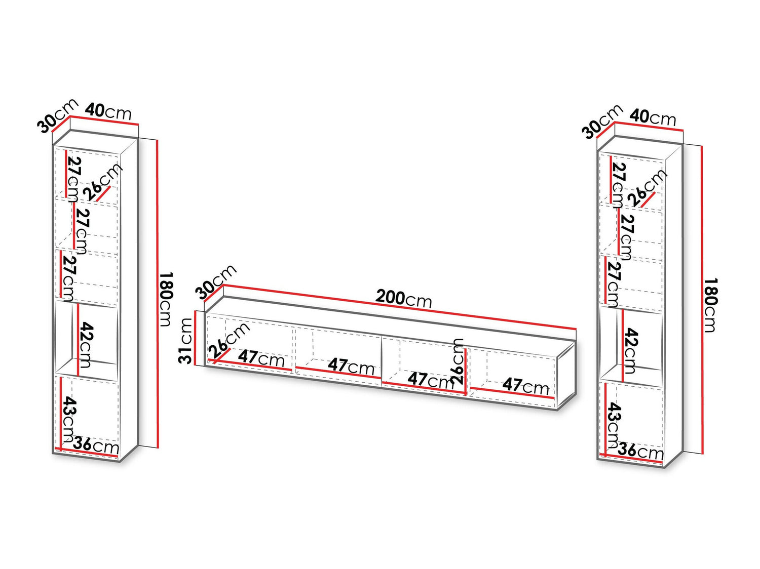 Piekaramo plauktu izmēri180 x 40 x 30 cm