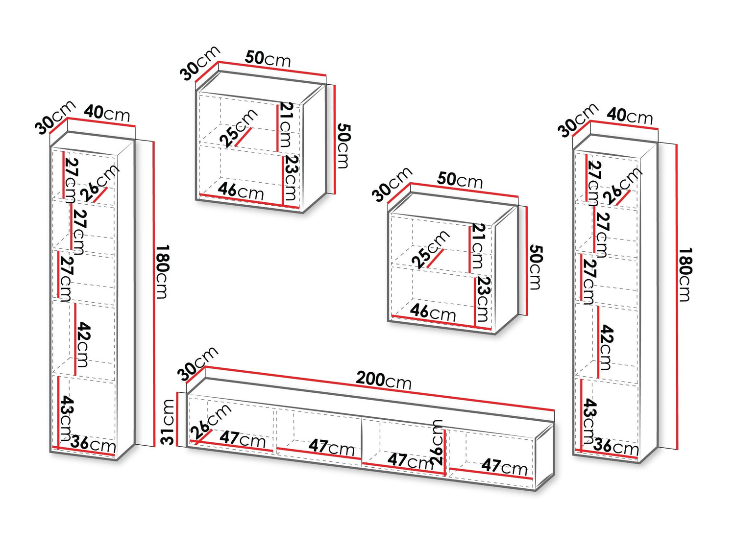 Piekaramo plauktu izmēri180 x 40 x 30 cm