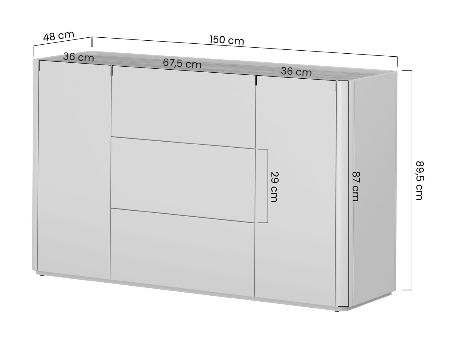 Kumodes izmēri89.5 x 150 x 48 cm