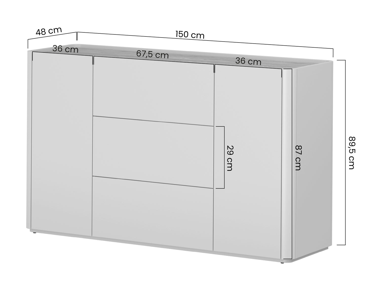 Kumodes izmēri89.5 x 150 x 48 cm
