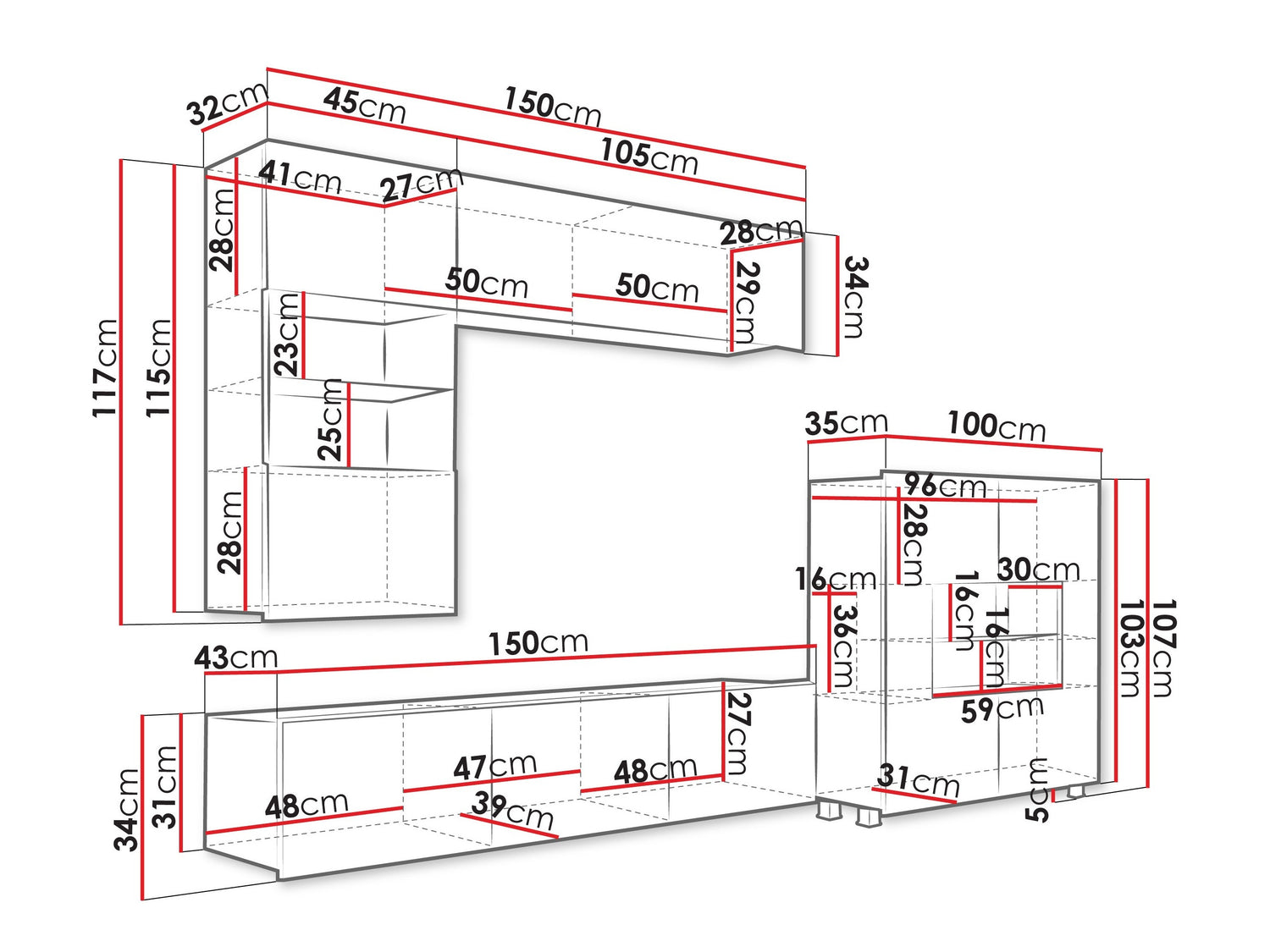 Piekaramā skapja izmēri34 x 105 x 32 x 45 x 35 cm