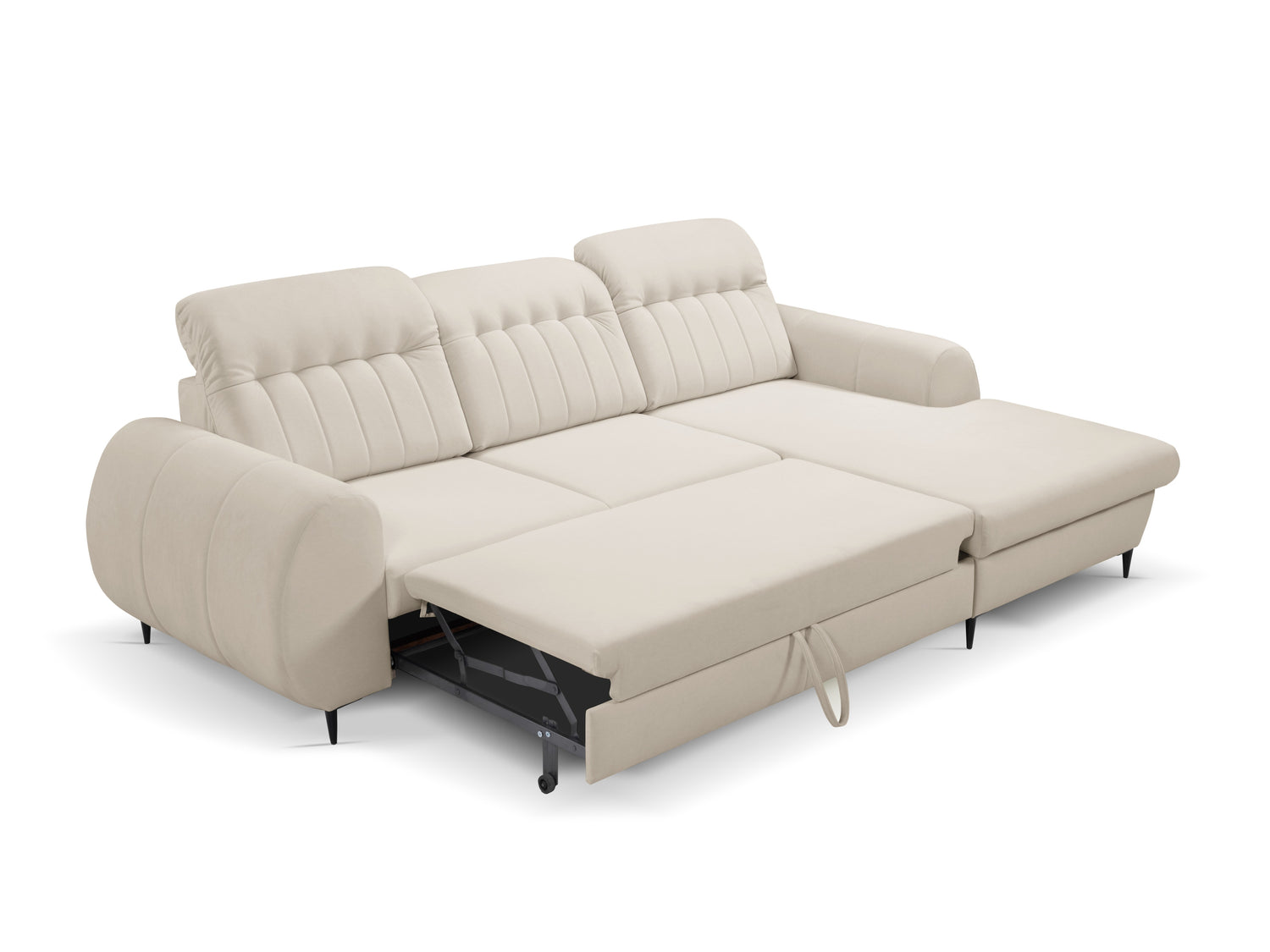 Это простое и удобное решение, которое позволит без особых усилий трансформировать мебель. Выдвижной ящик под сиденьем невидим, а если выдвинуть его, то мебель станет отличным местом для сна. Чтобы сложить мебель, просто потяните нижнюю часть на себя и таким образом выдвиньте ящик с дополнительной спальной зоной. С помощью петли вставьте матрас внутрь. Это спальное место немного жёстче, чем обычно. Благодаря фиксированной спинке мебель с этим механизмом можно поставить прямо у стены.