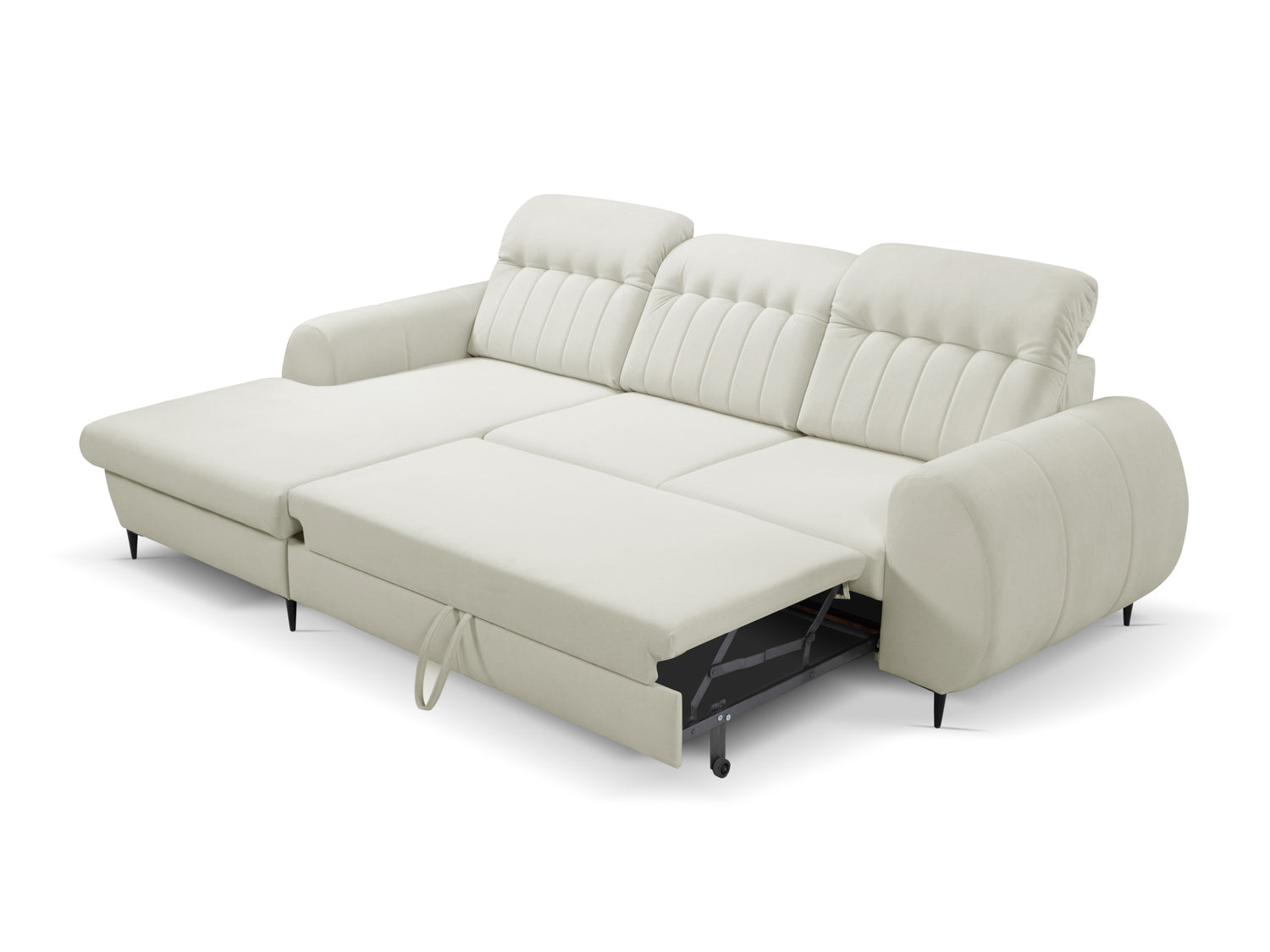 Это простое и удобное решение, которое позволит без особых усилий трансформировать мебель. Выдвижной ящик под сиденьем невидим, а если выдвинуть его, то мебель станет отличным местом для сна. Чтобы сложить мебель, просто потяните нижнюю часть на себя и таким образом выдвиньте ящик с дополнительной спальной зоной. С помощью петли вставьте матрас внутрь. Это спальное место немного жёстче, чем обычно. Благодаря фиксированной спинке мебель с этим механизмом можно поставить прямо у стены.